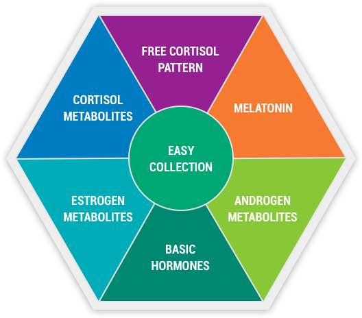 This test also measures cortisol and cortisone rhythms and levels, as well as estrogen metabolism pathways.